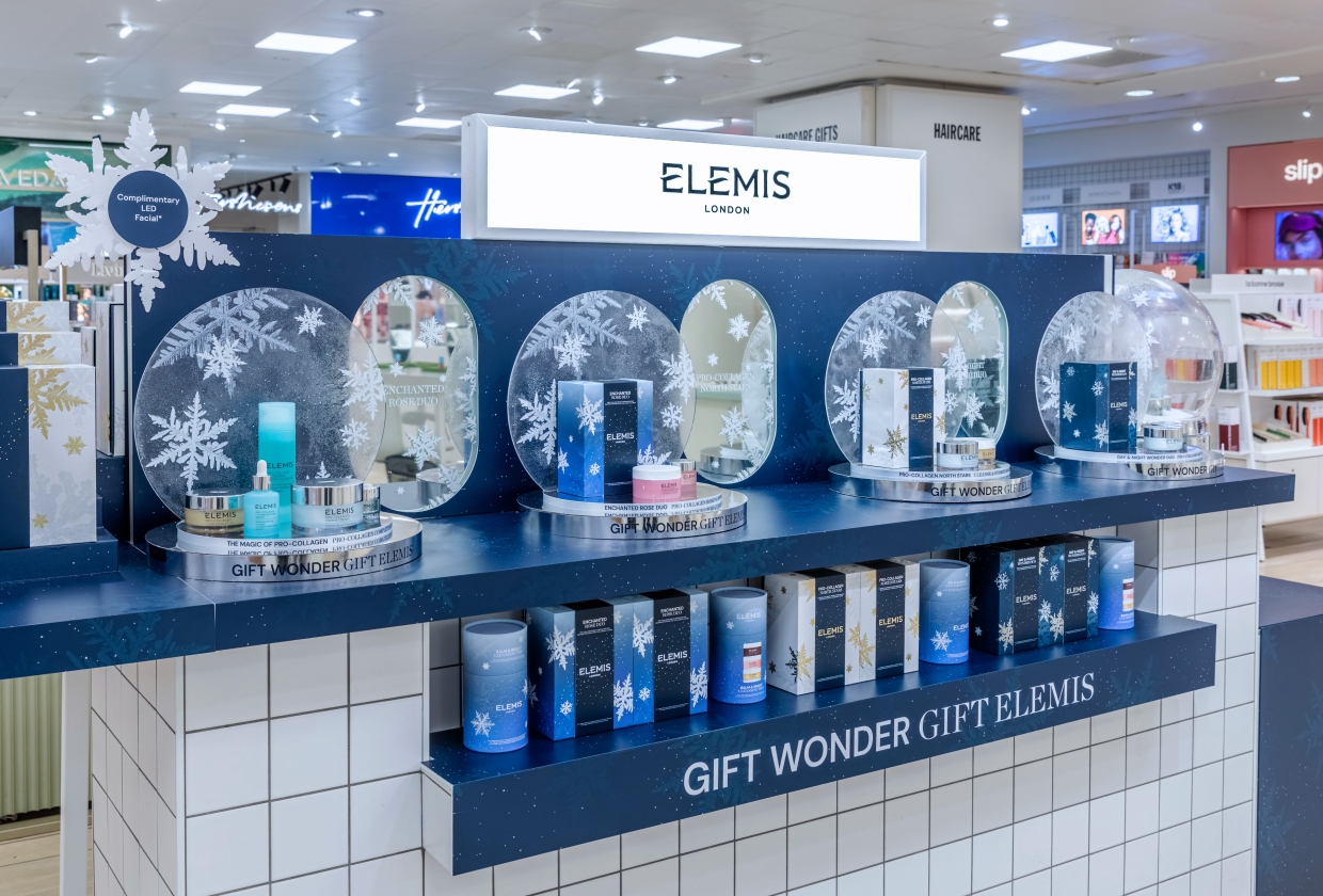 While the season can feel loud and fast, ELEMIS offers a moment of stillness. For the Gift ELEMIS campaign, finely detailed snow globes with intricate snowflakes formed the centrepiece, a showcase of craftsmanship on an exceptionally tight timeline. Soft textures, spa-inspired materials, and tonal finishes create a restorative environment aligned perfectly with the brand’s wellness-first DNA.