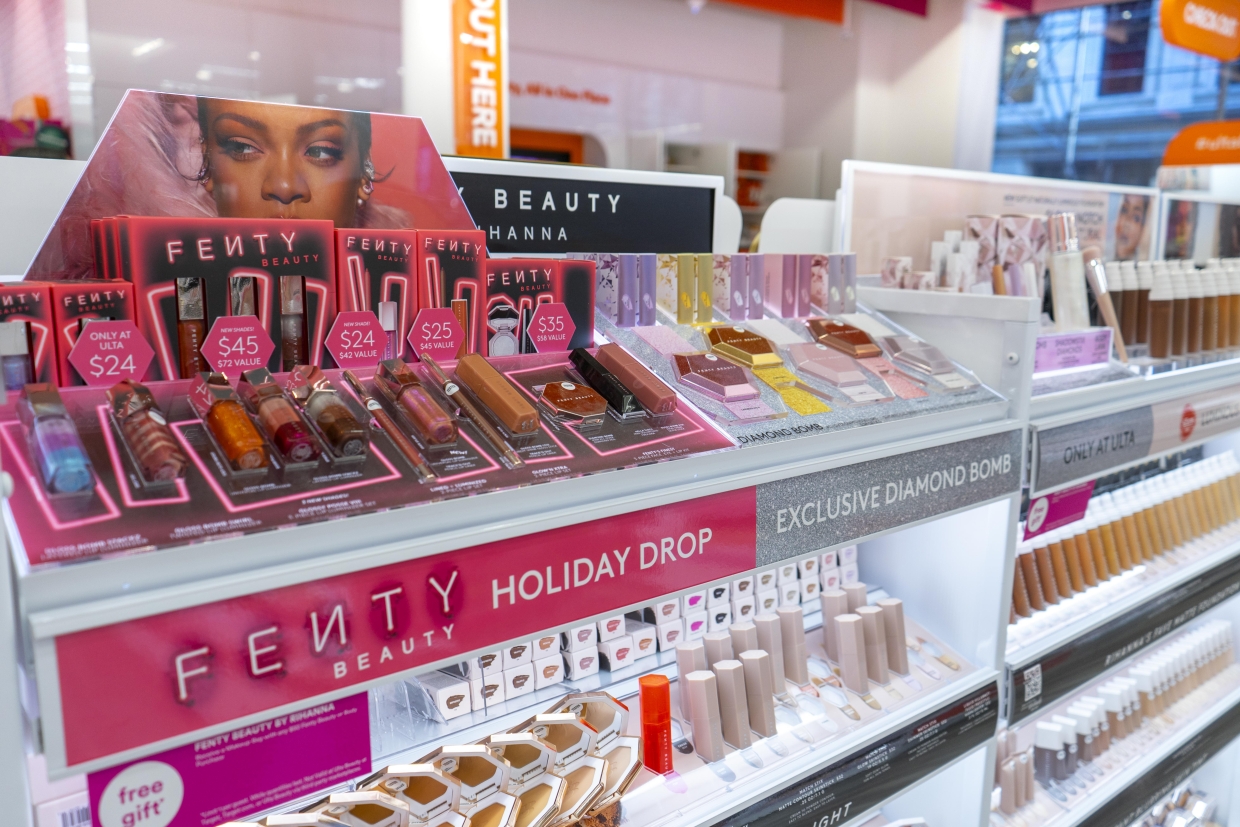 This is holiday storytelling driven by sensory calm, not spectacle, an in-store moment that invites shoppers to slow down, breathe, and connect. Fenty approaches the holiday season with unapologetic vibrancy. Neon pinks, illuminated frames, and dynamic layouts command attention. The displays invite touch, experimentation, and play turning the store into an interactive beauty playground. This is retail designed for engagement: bold, expressive, and inherently shareable. Fenty transforms shopping into celebration.