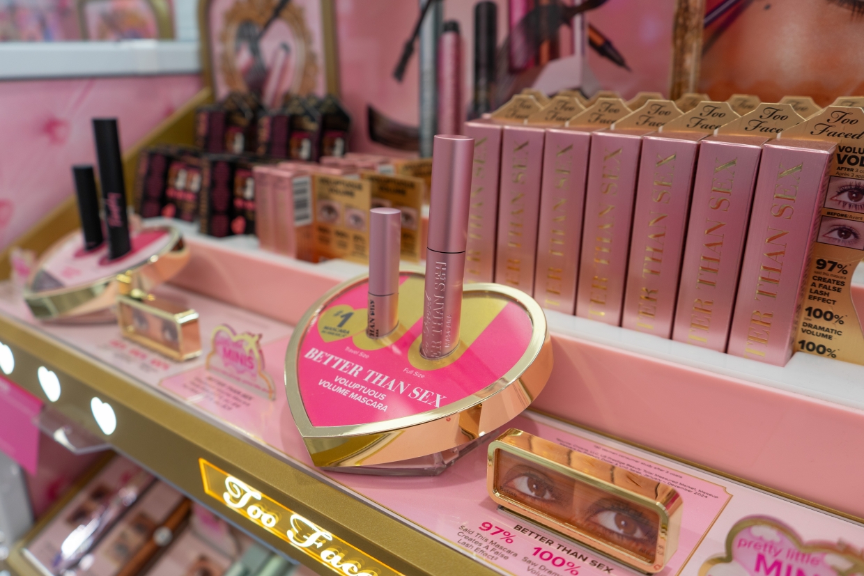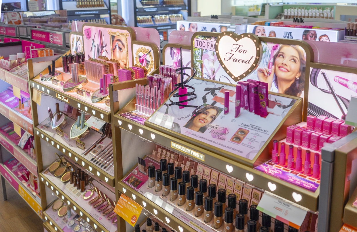 Featuring ornate frames, softly backlit signature heart motifs, and unique 3D-printed elements like a mascara wand and injection-molded lips, the display draws shoppers into the brand’s glamorous world.